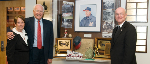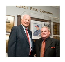 Gordie Gillespie was honored at the “A Lewis University Tribute to Coach Gordie Gillespie” event on September 30th on our main campus, and also at a Banner Raising Ceremony honoring the 1974, 1975 and 1976 NAIA National Championship teams at Homecoming on October 2nd. Thank you to the many Gillespie family members, friends, former players and donors to the Carey-Gillespie Endowed Scholarship Fund who attended the events. Neil Carey ’54 (pictured at right), a member of Gillespie’s first basketball team at Lewis, was among those present to honor Gillespie.
